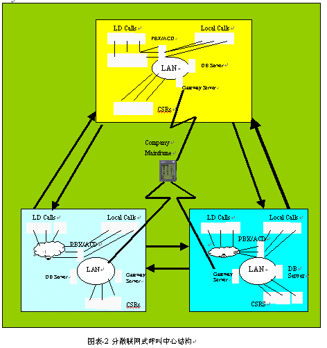 。。對(duì)于獨(dú)立或集中式呼叫中心而言,來電通常不能被自由地在該類型的呼叫中心之間轉(zhuǎn)接與信息共享。對(duì)于每一個(gè)獨(dú)立式呼叫中心而言,都擁有同樣的語音及數(shù)據(jù)基礎(chǔ)架構(gòu),他們彼此間的唯一區(qū)別就是支持來話的能力,或者說規(guī)模的不同,以及所處地理位置的不同。為了顧客方便的需要,這種類型的呼叫中心通常被建在人口眾多,經(jīng)濟(jì)相對(duì)比較發(fā)達(dá)的大城市。同時(shí),這些大城市中擁有非常巨大的潛在消費(fèi)人群和客戶。坐落在這些大城市或距大城市很近的呼叫中心,每日處理大量來自于當(dāng)?shù)氐碾娫。因此,呼叫中心要減少來自于800號(hào)企業(yè)負(fù)擔(dān)的電話通訊費(fèi)用。此外,在大城市及其周圍也為呼叫中心提供了大量的勞動(dòng)力資源。而呼叫中心所需的維修支持與其他相關(guān)設(shè)備的供應(yīng)商通常也集中在這些區(qū)域,保證了對(duì)其服務(wù)的快速響應(yīng)。