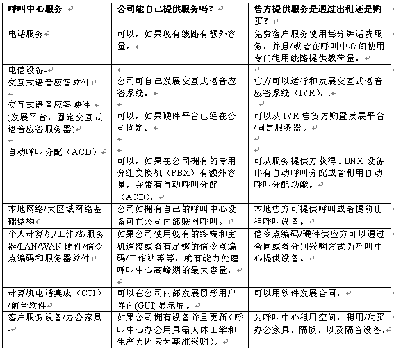 。。一旦決定從事呼叫中心業(yè)務(wù),公司必須確定要從外部售貨方購(gòu)買(mǎi)的服務(wù)與設(shè)備的范圍。公司政策和經(jīng)營(yíng)法則會(huì)指示其應(yīng)遵循什么程序進(jìn)行這一過(guò)程。也可能會(huì)是一些合同,它們可以使公司能夠快速地完成這些步驟。