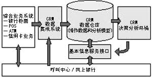在CRM數(shù)據(jù)倉(cāng)庫(kù)中,實(shí)際數(shù)據(jù)分為操作數(shù)據(jù)和分析模型。操作數(shù)據(jù)包括客戶基本信息、客戶賬務(wù)信息和操作控制(客戶個(gè)性化服務(wù)信息)。分析模型包括客戶關(guān)系管理的所有分析模型、市場(chǎng)分析、客戶信用度分析、客戶滿意度分析和銷售行為分析。因此,CRM的主體部分將通過數(shù)據(jù)集成系統(tǒng)與業(yè)務(wù)處理部分(綜合柜面系統(tǒng)等)和客戶聯(lián)系部分(呼叫中心等)連接起來。同時(shí),由于業(yè)務(wù)處理部分一般都采用銀行的現(xiàn)有系統(tǒng),而呼叫中心則可以成為一個(gè)相對(duì)獨(dú)立的模塊,因此,銀行CRM系統(tǒng)的實(shí)施主要體現(xiàn)在CRM數(shù)據(jù)集成系統(tǒng)、CRM數(shù)據(jù)倉(cāng)庫(kù)、CRM決策分析環(huán)境、基本信息服務(wù)接口等四大部分。