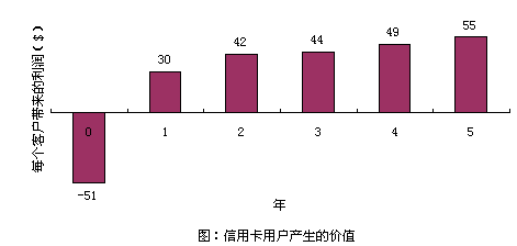 以信用卡服務(wù)為例,爭(zhēng)取一個(gè)新的用戶(hù)平均要51美圓,用于廣告、推銷(xiāo)和開(kāi)戶(hù)等開(kāi)支。用戶(hù)開(kāi)始時(shí)花錢(qián)很少,但為公司帶來(lái)一定的利潤(rùn)。但如果用戶(hù)繼續(xù)使用到第二年,就會(huì)為公司帶來(lái)更多的經(jīng)濟(jì)效益,因?yàn)楣九c客戶(hù)之間的信任和客戶(hù)對(duì)公司的滿(mǎn)意,致使客戶(hù)更多地通過(guò)信用卡消費(fèi)。(圖:"信用卡用戶(hù)產(chǎn)生的價(jià)值")用戶(hù)貢獻(xiàn)在增加,公司的運(yùn)作費(fèi)用卻在不斷減低。信用卡公司可以不斷減少對(duì)客戶(hù)信用的審核時(shí)間。保持長(zhǎng)期的客戶(hù)關(guān)系,還可以減少?gòu)V告支出,客戶(hù)本身就是一個(gè)免費(fèi)的廣告資源。很多人在消費(fèi)前喜歡聽(tīng)取朋友的意見(jiàn),覺(jué)得比廣告更可信。