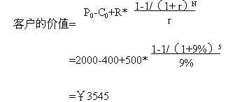 下面舉另一個(gè)例子具體說(shuō)明客戶(hù)價(jià)值的計(jì)算: 假設(shè)客戶(hù)與公司保持交易時(shí)間:N=5年;公司最初吸引每個(gè)客戶(hù)的成本(營(yíng)銷(xiāo)費(fèi)用): C0=¥400;客戶(hù)第一次購(gòu)買(mǎi)的產(chǎn)品價(jià)格:P0=¥2000;公司期望每年從每個(gè)客戶(hù)處增加的收入:R=¥500;利率(一般指貸款利率): r =9%;那么客戶(hù)的價(jià)值等于:客戶(hù)初次購(gòu)買(mǎi)產(chǎn)品和以后幾年每年消費(fèi)價(jià)值的折現(xiàn)之和,減營(yíng)銷(xiāo)成本,即: