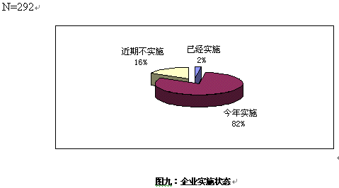 對大多數(shù)企業(yè)來說,對CRM還處于關(guān)注階段,只有7家企業(yè)表示已經(jīng)開始實施,在的電話訪問中,了解到這7家企業(yè)的實施的主要是在渠道管理和客戶呼叫中心等方面,但表示今年會開始實施的卻超過8成。