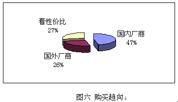 鑒于國內(nèi)并沒有知名度很高的CRM實施廠商,而國外的著名廠商在國內(nèi)的品牌宣傳也不足,所以調(diào)查表中只設(shè)了:國內(nèi)廠商、國外廠商和根據(jù)性價比進(jìn)行選擇三個項目,與購買能力對照,預(yù)期實施金額在100萬以下的企業(yè),一般側(cè)重國內(nèi)廠商,而實施金額在100萬以上企業(yè)則側(cè)重國外企業(yè)。