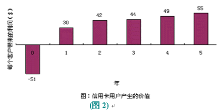 以信用卡服務(wù)為例,爭取一個新的用戶平均要51美圓,用于廣告、推銷和開戶等開支。用戶開始時花錢很少,但為公司帶來一定的利潤。但如果用戶繼續(xù)使用到第二年,就會為公司帶來更多的經(jīng)濟(jì)效益,因為公司與客戶之間的信任和客戶對公司的滿意,致使客戶更多地通過信用卡消費。(圖:"信用卡用戶產(chǎn)生的價值")用戶貢獻(xiàn)在增加,公司的運作費用卻在不斷減低。信用卡公司可以不斷減少對客戶信用的審核時間。保持長期的客戶關(guān)系,還可以減少廣告支出,客戶本身就是一個免費的廣告資源。很多人在消費前喜歡聽取朋友的意見,覺得比廣告更可信。