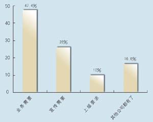 在問到對CRM的熟悉程度方面,有12家表示熟悉,占到63.2%,另有7家表示不熟悉,說明許多企業(yè)已經(jīng)對CRM有一定了解,不過也仍有相當大的市場空間。其中有8家建立了CRM系統(tǒng),占到42%,計劃建立的有9家,占到47.4%,而有2家表示短期不會建立。從調(diào)查發(fā)現(xiàn),幾乎所有受訪者都接受和認同CRM,盡管有一些企業(yè)還不熟悉,但在調(diào)查問卷中對此表現(xiàn)出極大的興趣。在CRM的采購動機上,有9家表示是為了提高業(yè)務,占到將近一半的比例(47.4%),而有5家表示出于企業(yè)宣傳,2家屬于上級主管部門要求,有3家表示是出于同行的示范。調(diào)查顯示,企業(yè)獲得CRM的信息來源很廣,最多的是通過報刊雜志的廣告,有6家,占31.6%,而上級推薦和供應商推薦各有4家,各占21%,有兩家是集成商推薦,此外還有3家通過展會獲得相關(guān)信息。