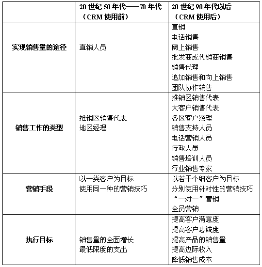 變革的苗頭已經(jīng)出現(xiàn)并且正在按自己的規(guī)律發(fā)展,F(xiàn)在的銷售經(jīng)理已經(jīng)發(fā)現(xiàn),他們既掌管著已經(jīng)失去傳統(tǒng)力量、效率和聲譽(yù)的一線銷售隊伍,又掌管著一個集合了數(shù)據(jù)庫營銷、電話銷售和具備全部自動化銷售工具庫的最佳效果的、更強(qiáng)有力的銷售組織。銷售經(jīng)理的角色在CRM使用前后正發(fā)生著深刻的變化。
