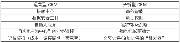 一般情況下CRM的可分為兩大類:即運營型CRM和分析型CRM。(有時把"協(xié)作型CRM"單獨作為一類)。多數(shù)情況之下運營型CRM引用的是產(chǎn)品,服務(wù)和一個企業(yè)實際能夠"照料"客戶的運做能力。關(guān)系中心,數(shù)據(jù)集合系統(tǒng)及Web站點僅僅是一些例子。分析型CRM主要指用來推動"以客戶為中心"的戰(zhàn)略和工具。商務(wù)智能系統(tǒng),數(shù)據(jù)挖掘工具及客戶層級戰(zhàn)略都可以算在這個范疇之內(nèi)。