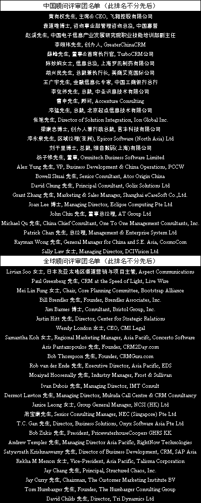 五、 權(quán)威性。GreaterChinaCRM邀請該機構(gòu)50多位(包括中國和外國)最權(quán)威的CRM專家擔(dān)當(dāng)此次評選的評審團。