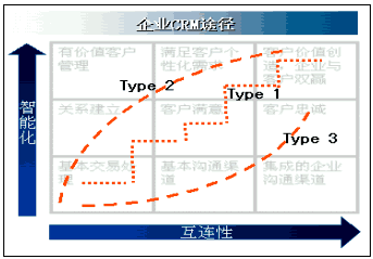 1是"小步快跑"型,Type 2是"改革優(yōu)先"型,Type 3是"技術(shù)驅(qū)動"型,如下圖所示。圖中互連性,表示企業(yè)信息化環(huán)境建設(shè)的規(guī)模,也意味著企業(yè)與客戶的交互程度,即溝通能力;縱坐標(biāo)所示的智能化,代表管理思想、管理模式、知識應(yīng)用和情感投入,是客戶關(guān)系管理中人性化和價(jià)值衡量的雙重體現(xiàn)。