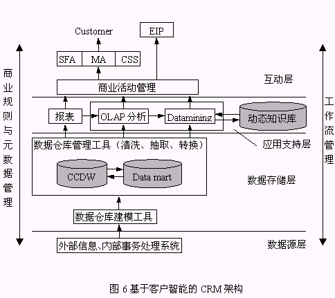 圖6是本文給出的以客戶智能為核心的I-CRM系統(tǒng)架構。從數(shù)據(jù)源層來的客戶數(shù)據(jù)經(jīng)過ETL(抽取、轉換、裝載)、清洗后以數(shù)據(jù)存儲層的CCDW或數(shù)據(jù)集市的形式存儲。應用支持層是提供了報表查詢、OLAP、知識發(fā)現(xiàn)分析決策工具,作用于客戶數(shù)據(jù),該過程產(chǎn)生的有價值的客戶知識存儲于動態(tài)知識庫中;訉犹峁┝薎-CRM利用客戶知識從而有效實施其功能的場所。該架構具有以下特點: