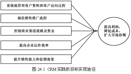 維奧制藥針對自身特定的業(yè)務需求,結(jié)合CRM的經(jīng)營理念,提出圖24.1所示CRM實踐的目標實現(xiàn)途經(jīng)。