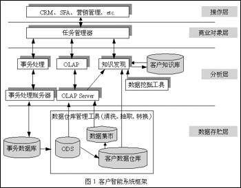 圖1描述了一個(gè)典型的客戶智能系統(tǒng)體系結(jié)構(gòu)。面向特定的應(yīng)用,客戶智能的體系結(jié)構(gòu)會(huì)有所改進(jìn),以使系統(tǒng)與具體的業(yè)務(wù)相符。例如:建立何種數(shù)據(jù)存貯和數(shù)據(jù)模型能很好地支持主題,支持客戶數(shù)據(jù)分析和客戶知識(shí)發(fā)現(xiàn)的需要;選擇何種決策分析工具;將發(fā)現(xiàn)的客戶知識(shí)通過何種接口傳送給相應(yīng)的用戶等等,都需要實(shí)際情況結(jié)合起來考慮。