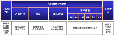 造成這樣的結(jié)果, 關(guān)鍵在于僅僅用產(chǎn)品或服務(wù), 無(wú)法表達(dá)出客戶對(duì)企業(yè)完整的價(jià)值取向. 我們還需要更豐富的管理理念來(lái)表達(dá)出企業(yè)對(duì)客戶所有的價(jià)值提供. 這一概念其實(shí)早已由埃森哲提出, 我們稱之為”Customer Offer”. 其內(nèi)涵在國(guó)內(nèi)的實(shí)際項(xiàng)目中已經(jīng)得到實(shí)踐的檢驗(yàn), 并取得良好的效果(該項(xiàng)目為某國(guó)內(nèi)領(lǐng)先的電信運(yùn)營(yíng)企業(yè)的CRM項(xiàng)目, 于2003年底完成).