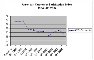 再看美國客戶滿意度指數(shù)(ACSI)的統(tǒng)計,顯示客戶滿意度正在逐步下跌,考慮到這一點,很明顯可以看出人們正越來越脫離客戶的本質(zhì)。