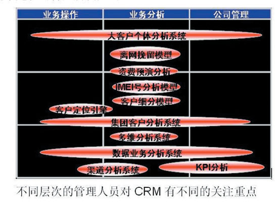 同理,面向大客戶和集團(tuán)客戶工作的大客戶個體分析系統(tǒng)和集團(tuán)客戶分析系統(tǒng)因?yàn)槠涿嫦蛞粋部門的特殊性,所以橫跨了業(yè)務(wù)操作、業(yè)務(wù)分析和管理三個層次。只有將CRM系統(tǒng)的建設(shè)按照模塊化結(jié)構(gòu)化的思路進(jìn)行才能真正滿足用戶的實(shí)際需求和其日常工作與業(yè)務(wù)緊密聯(lián)系起來,使CRM系統(tǒng)發(fā)揮出應(yīng)有的效果。