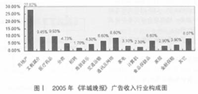 廣告客戶在報(bào)紙投放廣告的目的在于說服讀者成為其產(chǎn)品或服務(wù)的消費(fèi)者,他們最感興趣的是向那些最有可能成為其消費(fèi)者的讀者做廣告,而“報(bào)紙讀者與廣告目標(biāo)受眾的相關(guān)性決定了廣告信息是否能夠到達(dá)廣告客戶所希望的人群”。為此,廣告客戶更愿意在其目標(biāo)消費(fèi)群接觸率高的報(bào)紙上投放廣告。由于《羊城晚報(bào)》的讀者群具有學(xué)歷較高、職業(yè)較穩(wěn)定、收入較高、消費(fèi)能力較強(qiáng)等特點(diǎn),因此成為房地產(chǎn)、汽車、電訊、家具等耐用消費(fèi)品行業(yè)塑造品牌的平臺(tái)。另外,《羊城晚報(bào)》的讀者以家庭訂戶為主,他們對(duì)健康、教育、休閑、娛樂比較關(guān)注,因此醫(yī)藥、文化教育、食品保健品、旅游等廣告在羊城晚報(bào)也占有較大比例(見圖Ⅰ,統(tǒng)計(jì)期間為2005年1月-10月)。