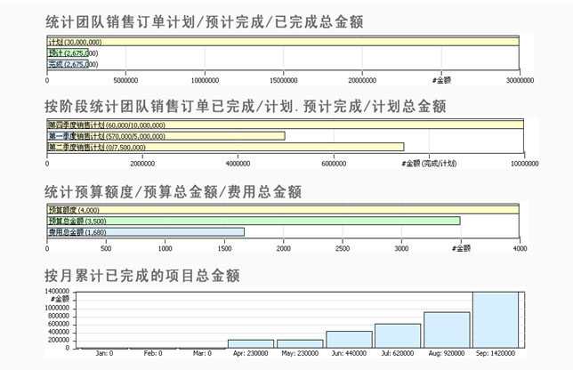 在VamCRM項目組合管理中集成項目數(shù)據(jù)的統(tǒng)計與分析,可以直接監(jiān)控項目計劃、預(yù)計及完成的項目數(shù)量、總金額和費用的統(tǒng)計,也可按月累計已完成的項目數(shù)量、總金額和費用,直接衡量項目實施的結(jié)果與效益。在費用管理模塊中集成費用數(shù)據(jù)的統(tǒng)計與分析,對于所有費用可以按人及費用類型進行統(tǒng)計,實時知道哪一個人或哪一類費用開銷最多,以及費用與預(yù)算的對比分析。