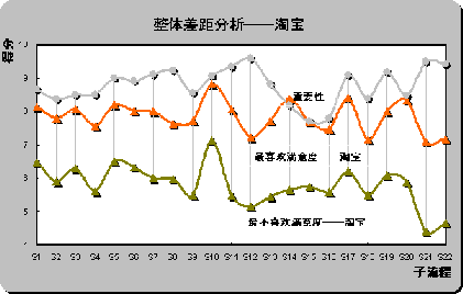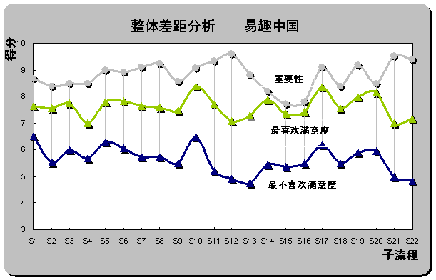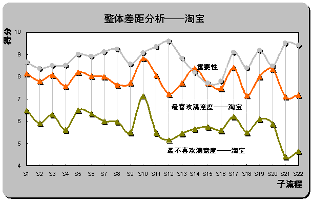 2) 重要流程欠缺最優(yōu)體驗。雖然易趣中國被認為是最不喜歡的在線銷售網站,但從滿意度評分也同時可以發(fā)現,易趣中國在S1(瀏覽速度),S16(個人定制促銷信息的發(fā)布)和S15(個性化頁面設置)還是為用戶設計了相對較好的體驗。但重要性得分排名前三位的子流程中,S12(產品質量可靠)、S21(退換貨服務)和S22(客戶投訴和反饋)仍為重要性與滿意度差距最大的三個子流程,易趣中國也未在重要流程上為用戶設計優(yōu)越的在線體驗。