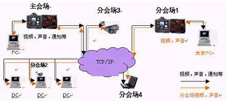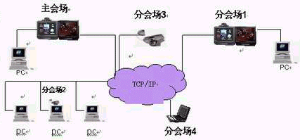 會議的組織,召開,管理由主會場來完成。因此,主會場的視頻,聲音,通知,指示,下達的文件資料各分會場都應該收到。當某分會場發(fā)言時,其視頻,聲音同樣要傳送給其他會場。(如下圖所示)上述所有動作的完成依賴組播技術。通過組播技術把主會場的各種數據發(fā)送到參加會議的分會場中,而且把發(fā)言分會場的視音頻數據發(fā)送給其他會場:即主會場和發(fā)言分會場的各種數據只要在網上發(fā)送一次,其他會場都將收到此數據,(這就是有別于點對點通信方式的地方)而與這兩個會場在同一網段卻不參加會議的非成員不會收到數據(只要設備支持,這也是有別于廣播的地方)。因此,當會議成員增加時,不會產生信息傳輸量劇增,帶來無法忍受的網絡延時和抖動。