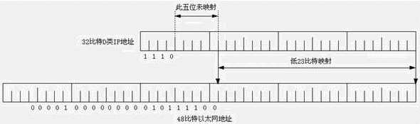 D類地址的最后28比特沒有結構化,即沒有網絡ID和主機ID之分。響應某一個IP多播地址的主機構成一個主機組,主機組可跨越多個網絡。主機組的成員數是動態(tài)的,主機可以通過IGMP協議加入或離開某個主機組。IP多播地址影射到以太網地址的方法見下圖。因為IP多播地址的高5位未影射,因此,影射的以太網地址不是唯一的,共有32個IP多播地址影射到一個以太網地址。