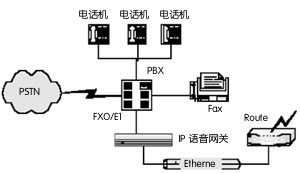 在這種應(yīng)用方式中, IP語音網(wǎng)關(guān)采用FXO接口與PBX(用戶電話交換機)互連,電話直接接入PBX,未接入PBX的外部電話,經(jīng)電話公網(wǎng)(PSTN)與PBX相連。