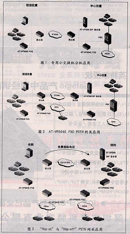 在圖2所示的應(yīng)用中,遠程局位置直接附加了一個AT-VP504E FXO裝置,為PSTN提供IP電話網(wǎng)關(guān)服務(wù),IP語音呼叫被轉(zhuǎn)化為模擬格式通過標準電話線路進行傳輸。同樣,來自普通電話網(wǎng)絡(luò)的呼入呼叫,也被轉(zhuǎn)化為IP呼叫通過企業(yè)IP網(wǎng)絡(luò)轉(zhuǎn)接。這就使本地PSTN呼叫者,可向企業(yè)或其他目的地打免費長途電話。