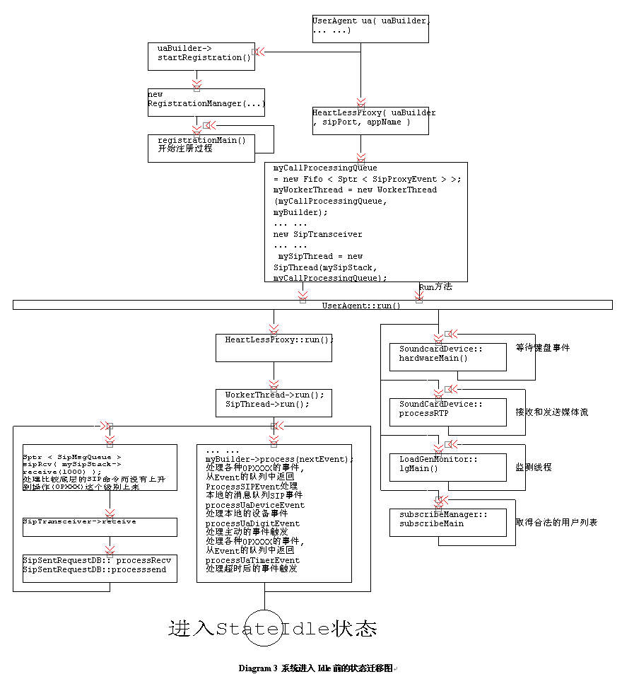 構(gòu)建User Agent的工作已經(jīng)完畢,現(xiàn)在應(yīng)該讓調(diào)用它的Run方法了;從下面的程序可以看到,Run方法的調(diào)用,讓整個程序進入一種"Idle"的狀態(tài),等待命令輸入和狀態(tài)的產(chǎn)生,這個過程我們可以看到在Ua.CXX的Main程序中調(diào)用(ua.run())。