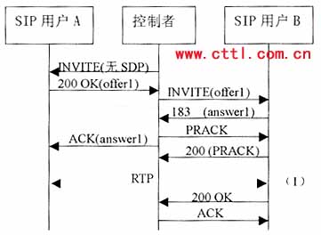 控制者再向B發(fā)送一個(gè)沒有SDP的INVITE。B應(yīng)答的200 0K響應(yīng)中包含一個(gè)提供offer2,控制者應(yīng)該基于offer2向A發(fā)送一個(gè)re-INVITE,注意。offer2可能需要稍作修改來(lái)滿足媒體要求。例如如果offer1包含一個(gè)音頻和一個(gè)視頻行,而offer2只有一個(gè)音頻行,控制者就需要在offer2中增加一個(gè)視頻行(端口設(shè)為O)來(lái)構(gòu)成offer2’。由于這是一個(gè)re-INVITE,所以通常應(yīng)該能立即收到響應(yīng)。A的200