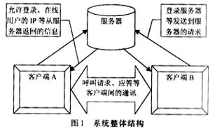 通過(guò)設(shè)置一個(gè)信令服務(wù)器的方式綜合以上兩種方式的優(yōu)缺點(diǎn)。用戶通話程序工作于半客戶機(jī)狀態(tài),信令服務(wù)器負(fù)責(zé)客戶的集中呼叫。當(dāng)某一個(gè)客戶呼叫,服務(wù)器負(fù)責(zé)中轉(zhuǎn)呼叫,當(dāng)被叫客戶響應(yīng)呼叫并應(yīng)答后,自主于呼叫方進(jìn)行通話而不必經(jīng)過(guò)信令服務(wù)器,這樣,大幅度地減少了服務(wù)器的數(shù)據(jù)量。有了集中的信令服務(wù)器,也便于客戶的管理,還可進(jìn)行廣播消息的發(fā)布。