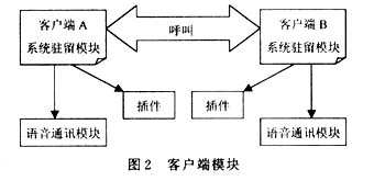如圖2所示,客戶端由2個(gè)主要模塊組成:系統(tǒng)駐留模塊、語(yǔ)音通訊模塊。
