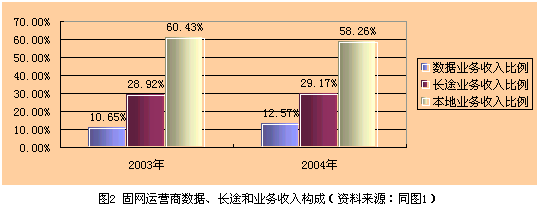 目前數(shù)據(jù)業(yè)務(wù)收入與話音業(yè)務(wù)收入相差懸殊,通過發(fā)展數(shù)據(jù)業(yè)務(wù)彌補(bǔ)VoIP造成的話音收入損失尚需時(shí)日。以固網(wǎng)運(yùn)營商為例,2003年和2004年數(shù)據(jù)業(yè)務(wù)、長途業(yè)務(wù)和本地業(yè)務(wù)收入構(gòu)成見圖2所示。