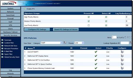 SonicWALL入侵檢測服務(wù)(IPS)能夠為VoIP協(xié)議應(yīng)用層提供全面保護(hù)。IPS集成了一個可配置的超高性能掃描引擎,配合動態(tài)更新和擁有1900多攻擊和漏洞簽名的數(shù)據(jù)庫,可以保護(hù)網(wǎng)絡(luò)免受最復(fù)雜的木馬和變形威脅的影響。SonicWALL已經(jīng)利用一系列VoIP相關(guān)的簽名來擴展其IPS簽名數(shù)據(jù)包,可以防止惡意業(yè)務(wù)流到達(dá)受保護(hù)的VoIP電話和服務(wù)器。