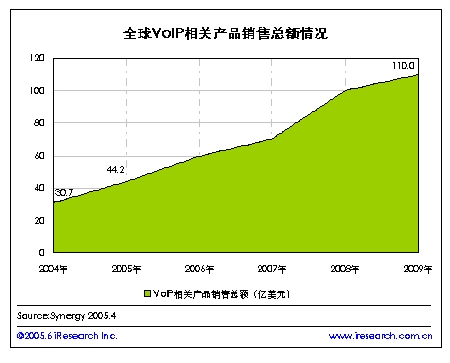 艾瑞市場咨詢(iResearch)根據(jù)Synergy的數(shù)據(jù)整理顯示,隨著VoIP市場的開發(fā),企業(yè)用戶對VoIP的接受度增加,在2004年VoIP相關(guān)產(chǎn)品的銷售總額達到了30.7億美元,預計在2005年可達到44.2億美元,2009年將突破110億美元。