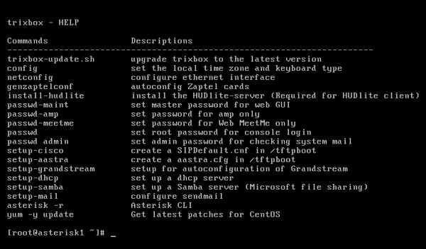 理論上,在安裝完成之后,用戶(hù)即可通過(guò)Web界面進(jìn)行配置,但是我們強(qiáng)烈建議用戶(hù)首先登錄進(jìn)入命令行界面,修改各組件相關(guān)的各個(gè)口令。使用help-trixbox功能,即可訪問(wèn)Trixbox主要組件的管理、升級(jí)、維護(hù)和配置腳本,如圖1所示。其中,以“passwd”為開(kāi)始的命令用于修改各主要管理界面的口令。此外,對(duì)于安裝了FXS/FXO語(yǔ)音卡的用戶(hù),需要首先運(yùn)行g(shù)enzaptelconf腳本,生成基本的zaptel配置文本。需要提醒的是,用戶(hù)應(yīng)該慎用yum-update命令,因?yàn)樵撁钪粚?duì)CentOS進(jìn)行常規(guī)更新,有可能會(huì)改變Asterisk相關(guān)的配置文件,使Asterisk在系統(tǒng)重新啟動(dòng)之后無(wú)法正常運(yùn)行。