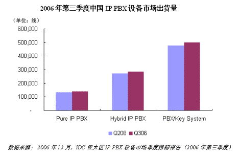 根據(jù)《IDC亞太區(qū)IP PBX市場(chǎng)季度跟蹤報(bào)告(2006年第三季度)》中國(guó)部分?jǐn)?shù)據(jù)顯示,2006年第三季度中國(guó)PBX系統(tǒng)出貨量接近100萬(wàn)線,其中純IP PBX占到15.1%,混合PBX占到30.9%,傳統(tǒng)PBX占到54%。
