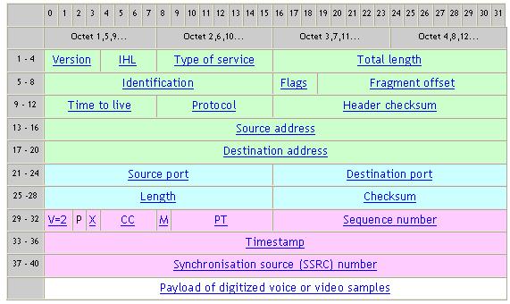 根據(jù)IETF的標準建議,通過IP網絡傳輸語音信號樣本需要增加三個額外的報頭,每個報頭對應一個網絡層次,即IP,UDP和RTP [4]。