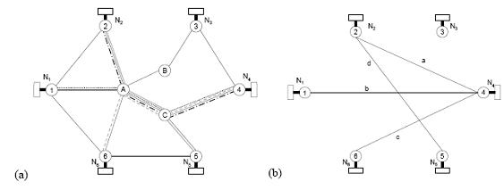 網絡拓撲如圖3(a)所示,以鏈路A-C為例,將通過鏈路A-C的端到端的呼叫分別表示為a, b, c, d,如圖3(b)所示, (i =