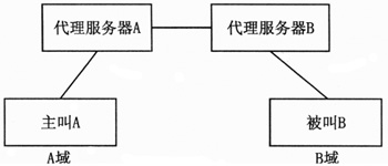 圖3給出了上述SIP消息選路過程。主叫A接入A域的代理服務(wù)器A后,代理服務(wù)器A查詢DNS,得到B域的代理服務(wù)器B的地址。最后由代理服務(wù)器B將invite消息發(fā)送至被叫B。在軟交換網(wǎng)絡(luò)中,代理服務(wù)器A和代理服務(wù)器B的功能都由軟交換機(jī)實現(xiàn)。