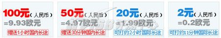 在skype的資費(fèi)列表中,沒(méi)有人民幣選項(xiàng),在Tom-Skype的充值選項(xiàng)中,僅提供了四種金額的充值100、50、20、和2元。從官方站點(diǎn)查到的價(jià)格為0.017歐元/分鐘(約合人民幣0.17元/分鐘)