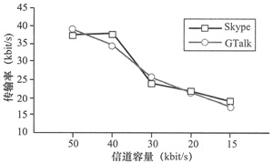 kbit/s時(shí),GTalk發(fā)生了很明顯的變化,傳輸速率降低到了35 kbit/s。這個(gè)變化使得其PESQ MOS分?jǐn)?shù)與Skype相比有所提高,而Skype的傳輸速率則接近信道容量。當(dāng)信道容量變?yōu)?0