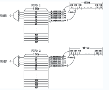 FIFO中的四幀數(shù)據(jù)被讀空時(shí)間大于第五幀的第一個(gè)字節(jié)寫入FIFO的準(zhǔn)備時(shí)間,F(xiàn)IFO的寫滿與讀空都是有硬件產(chǎn)生信號標(biāo)識,此時(shí)FIFO讀空信號標(biāo)識未產(chǎn)生,不能對同一FIFO進(jìn)行寫操作,導(dǎo)致待寫數(shù)據(jù)丟失。因此選用兩個(gè)FIFO采用乒乓機(jī)制來切換讀寫操作,如圖4所示。