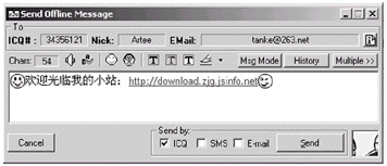 其它功能 支持界面更換,支持快捷鍵操作,可通過(guò)PtoP的方式傳送文件,支持語(yǔ)音交流,POP3新郵件檢查,支持直接向好友的手機(jī)發(fā)送短消息,傳呼等。