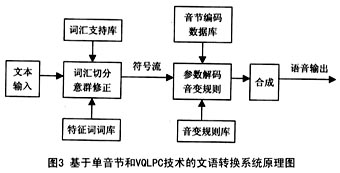 ----一 種 典 型 的 基 于 單 音 節(jié) 和VQLPC( 矢 量 量 化 的LPC) 技 術(shù) 的 文 語 轉(zhuǎn) 換 系 統(tǒng) 原 理 圖 如 圖3 所 示。