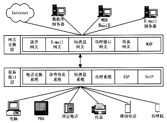 統(tǒng)一消息平臺(tái)集成了固定電話網(wǎng)、移動(dòng)電話網(wǎng)和Internet網(wǎng)絡(luò)。目前,電話網(wǎng)和Internet網(wǎng)各自擁有獨(dú)立的網(wǎng)絡(luò)資源和信息服務(wù)領(lǐng)域,而這兩大網(wǎng)絡(luò)的用戶群存在著很大的交叉。電話的使用在中國(guó)已經(jīng)占有很高的普及率,傳統(tǒng)的160/168聲訊服務(wù)已經(jīng)成為中國(guó)百姓所熟悉的最具代表性的電話信息服務(wù),而Internet作為在中國(guó)剛剛興起的信息媒體,尚需要普通百姓逐漸認(rèn)識(shí)它、使用它。統(tǒng)一消息平臺(tái)將電話網(wǎng)和Internet網(wǎng)結(jié)合在一起,極大地?cái)U(kuò)大了兩大網(wǎng)絡(luò)各自的用戶群,電話用戶可以用電話或者傳真獲取Internet上的信息,電子郵件服務(wù)也可以不局限于Internet,而能對(duì)廣大的電話用戶開(kāi)放。統(tǒng)一消息平臺(tái)為用戶帶來(lái)的是信息的方便、及時(shí),使人們?cè)谌魏螘r(shí)間、任何地點(diǎn)都能夠獲取需要的信息。