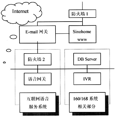 160/168聲訊平臺(tái)通過(guò)炎黃新星的網(wǎng)關(guān)產(chǎn)品與Internet相聯(lián),為了保證原有聲訊系統(tǒng)的安全性,在炎黃新星多終端信息訪問(wèn)平臺(tái)的網(wǎng)絡(luò)結(jié)構(gòu)中增加了防火墻設(shè)置,原有的160/168聲訊平臺(tái)置于防火墻的后端,只與炎黃新星的語(yǔ)音合成網(wǎng)關(guān)存在通信聯(lián)系。