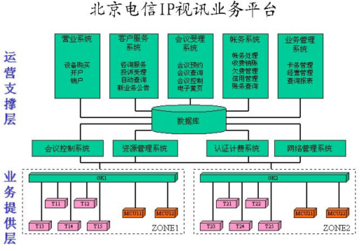 在整個運營支撐層的系統(tǒng)中,主要包括四大系統(tǒng),即會議控制系統(tǒng)、資源管理系統(tǒng)、認證計費系統(tǒng)、網(wǎng)絡(luò)管理系統(tǒng)。除此之外,還有其它幾個輔助系統(tǒng),包括營業(yè)系統(tǒng)負責為客戶開戶和銷戶,終端注冊等處理;客戶服務(wù)系統(tǒng)提供咨詢服務(wù)、投訴受理、自動查詢和幫助客戶進行會議預(yù)約,在資源不足的情況下進行會議調(diào)度等;會議受理系統(tǒng)是面向客戶提供會議電視業(yè)務(wù)預(yù)約、會議狀態(tài)查詢、會議控制服務(wù),由用戶自助完成預(yù)約會議和控制會議的操作;賬務(wù)系統(tǒng)負責賬務(wù)方面的管理,包括賬務(wù)管理,收費銷賬,催繳欠費、銀行繳費等;業(yè)務(wù)管理系統(tǒng)主要是記賬卡的卡務(wù)處理、經(jīng)營管理、查詢報表等。