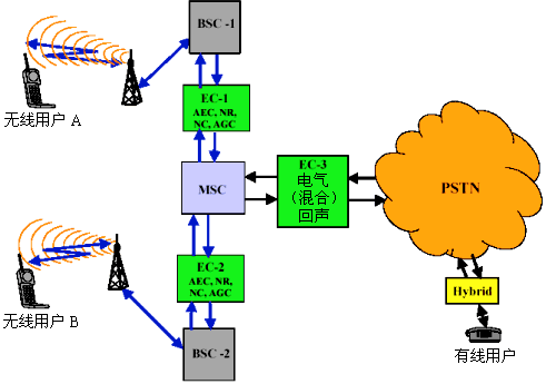 GSM實施了A-Interface(空中接口)體系結(jié)構(gòu)。在圖1中,給出了部署A-Interface戰(zhàn)略的通用GSM網(wǎng)絡(luò)配置。如圖所示,這種拓撲方案在A-Interface上采用了VQE(EC-1和EC-2)功能,在PSTN接口處僅采用了EEC(EC-3)功能。這種方案給出了一種技術(shù)出眾的格局。EC-3組件消除了源自"PSTN到移動"呼叫所致的電氣(混合)回聲,而EC-1和EC-2部件則在每一次的"移動對移動"以及"移動到PSTN"呼叫上提供了VQE(語音質(zhì)量增強)功能。