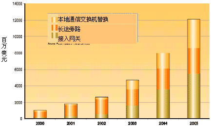 隨著因特網(wǎng)業(yè)務(wù)的普及,與傳統(tǒng)電信業(yè)務(wù)供應(yīng)商形成競爭、替代局面的新業(yè)務(wù)供應(yīng)商看到了重大的機(jī)會:利用通過包網(wǎng)絡(luò)傳送話音(VoP)業(yè)務(wù)取代分離的話音/數(shù)據(jù)網(wǎng)業(yè)務(wù)。VoP技術(shù)最初主要用于長途旁路。在過去的兩年里,VoP網(wǎng)絡(luò)的發(fā)展勢頭明顯加快,通過寬帶網(wǎng)傳送話音的接入網(wǎng)關(guān)正在推廣,利用VoP本地網(wǎng)關(guān)代替?zhèn)鹘y(tǒng)中心局交換機(jī)的機(jī)會也已出現(xiàn)。圖1用圖例說明了VoP在交換機(jī)替換、長途旁路和接入網(wǎng)關(guān)方面市場的分塊大小以及對末來的預(yù)測。