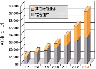 為了獲得競爭優(yōu)勢,業(yè)務(wù)提供商──傳統(tǒng)長途運(yùn)營和本地交換運(yùn)營商,因特網(wǎng)業(yè)務(wù)提供商(ISP),應(yīng)用業(yè)務(wù)提供商,以及無線運(yùn)營商──都在想方設(shè)法發(fā)布基于IP的業(yè)務(wù),這些業(yè)務(wù)應(yīng)該:對(duì)用戶有較高的價(jià)值,能縮短面市所需時(shí)間,部署是低成本高效益的。向用戶提供高價(jià)值的增值業(yè)務(wù)能為業(yè)務(wù)提供商帶來重要的收入源泉,并使他們更有特色,增加市場分額,特別是如果這些業(yè)務(wù)以快速、易于支持的方式部署,以上這些優(yōu)勢就會(huì)更加突出。據(jù)估計(jì),到2003年增值業(yè)務(wù)設(shè)備僅在美國就能達(dá)到73億美元的市場,正如圖1所示。