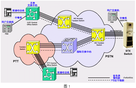 圖1給出了傳統(tǒng)電話網(wǎng)絡(luò)PSTN的組織結(jié)構(gòu)圖。它是目前規(guī)模最大的電話業(yè)務(wù)網(wǎng)絡(luò),通過標(biāo)準(zhǔn)的信令控制網(wǎng)絡(luò)(SS7),成為覆蓋全球的大型電話網(wǎng)絡(luò)。這個(gè)網(wǎng)絡(luò)和Internet互聯(lián)網(wǎng)有著驚人的相似,它們都采用級(jí)聯(lián)結(jié)構(gòu),具有易于擴(kuò)展的特性。